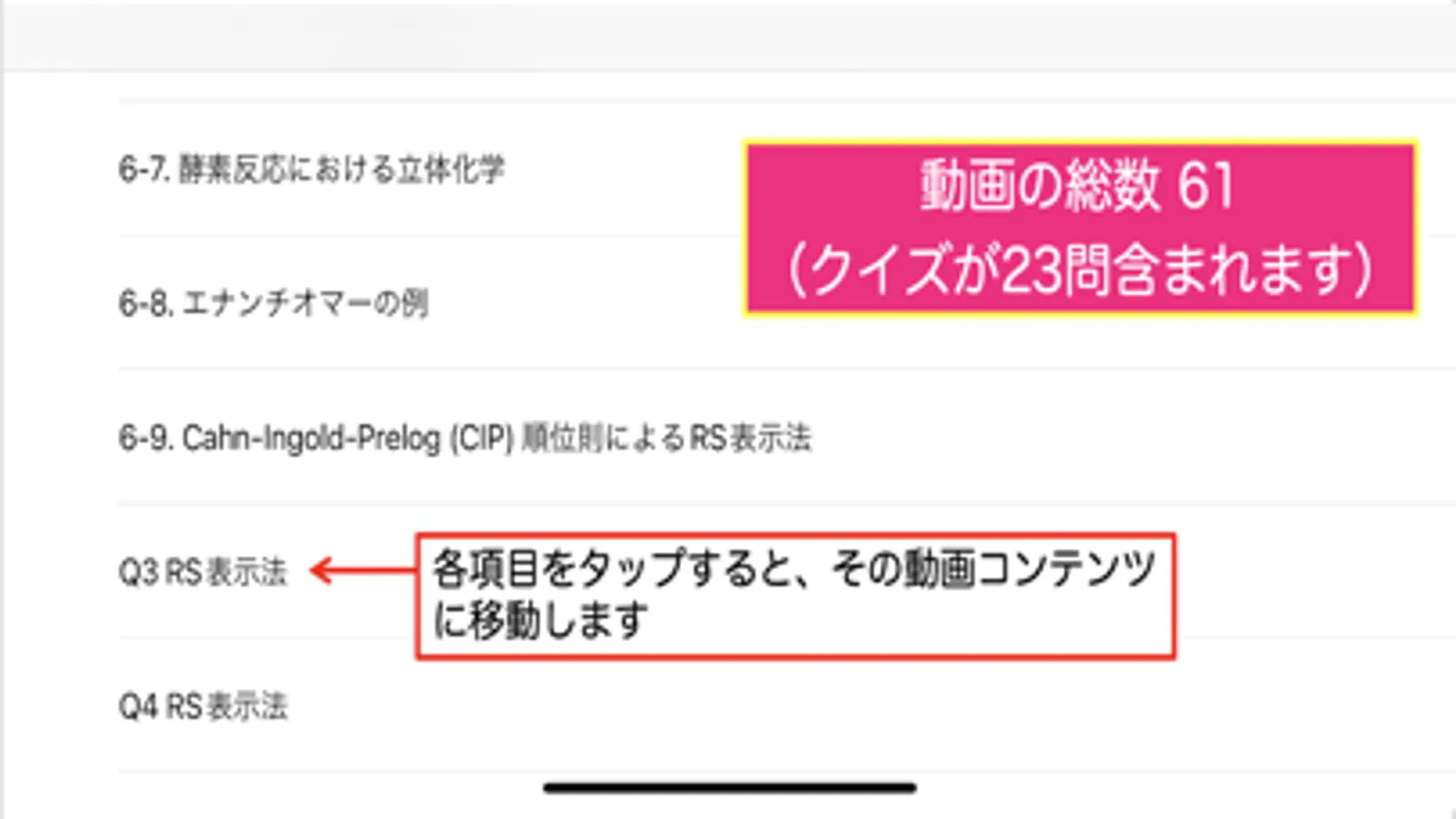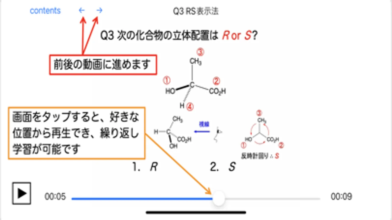 2.目次の各項目から、立体化学に関する解説や問題(Question)の動画に進むことができます。画面をタップするとシークバーが表示され動画再生できます。