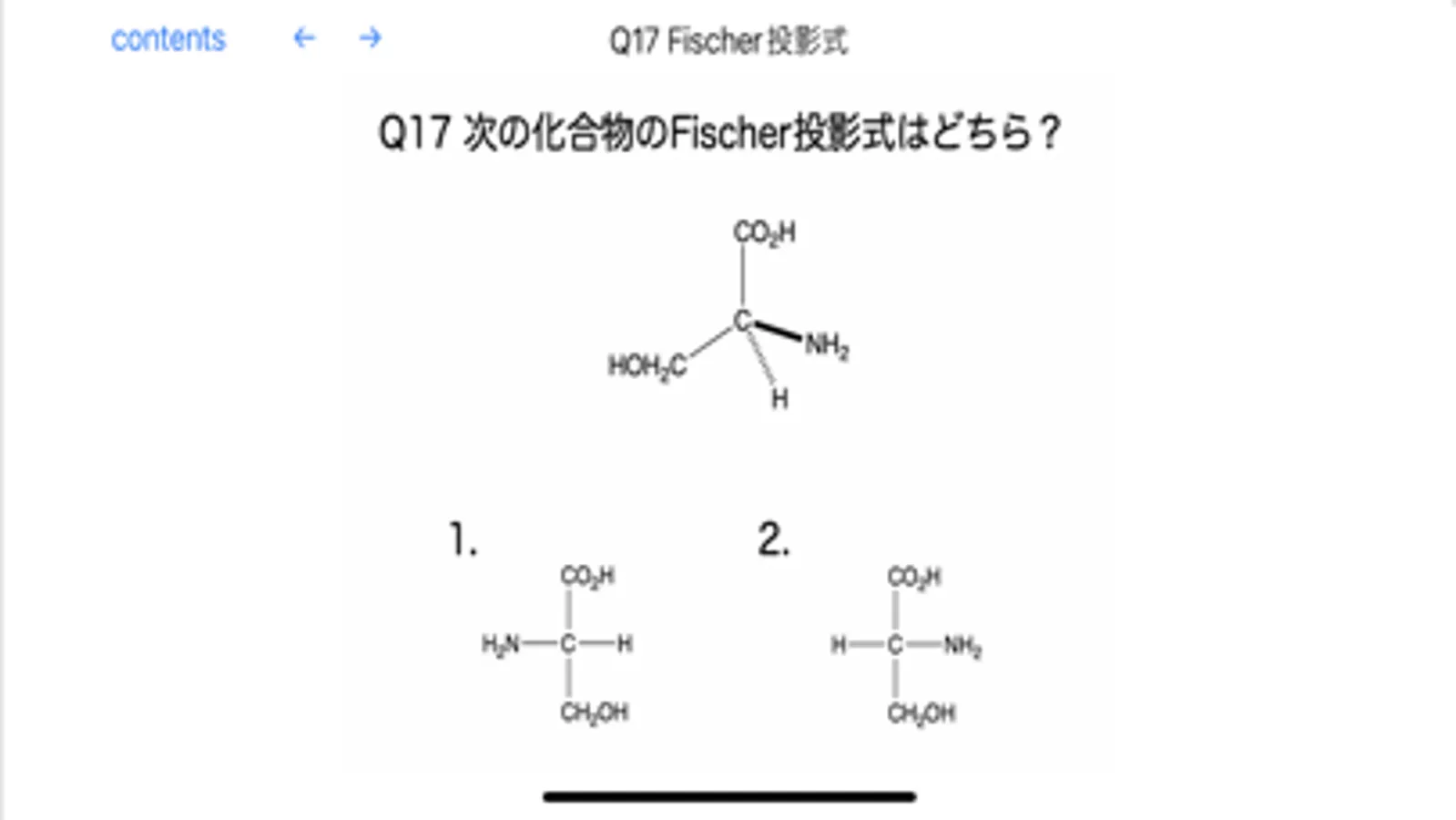 3.立体化学に関する解説が動画で表示されます。問題(Question)の場合、解答を考えたり、書いたりしてから動画再生して解説や解答に進むといいでしょう。各ページから目次に戻ることもできますし、前後の動画に進むこともできます。