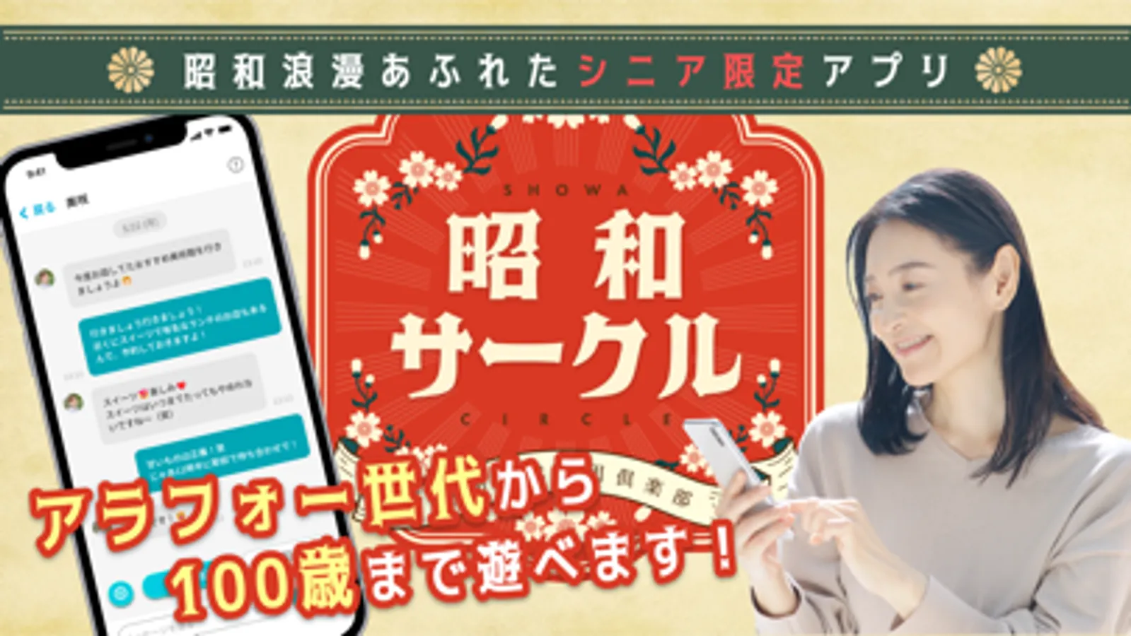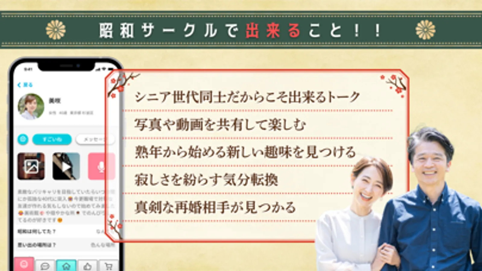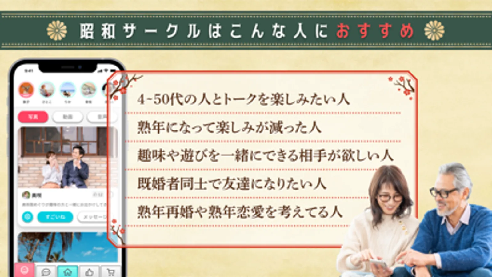 【昭和サークル】は時代の中心を生きるシニア世代の情報交換、異性と大人同士の出会い、共通の目的を持った仲間を募集する場を提供するため生まれました!