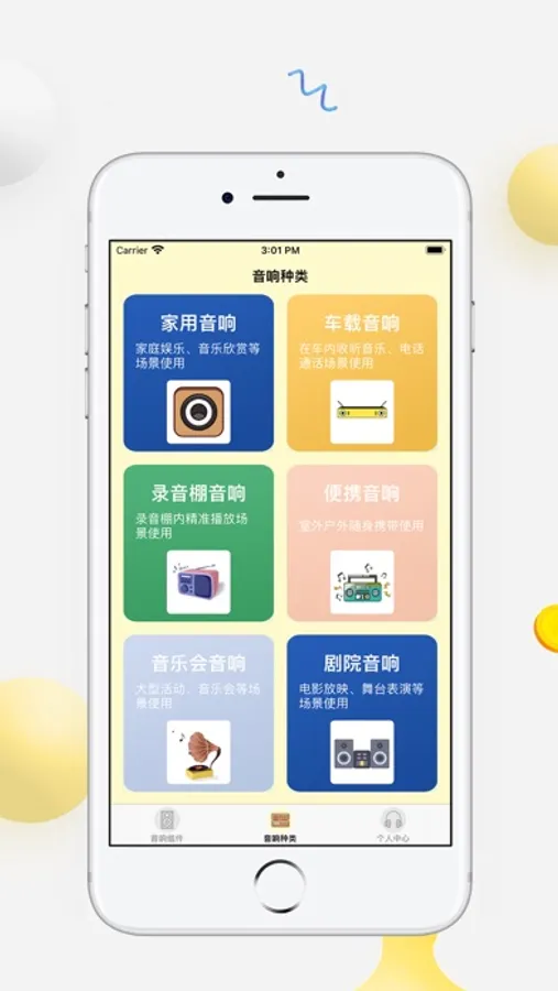 就音响种类而言则可分为家用音响、车载音响、录音棚监听音响、便携音响、音乐会音响、剧院音响等, 其音响配置因使用场景及对音质要求不同而有差异。