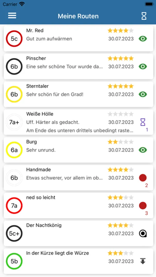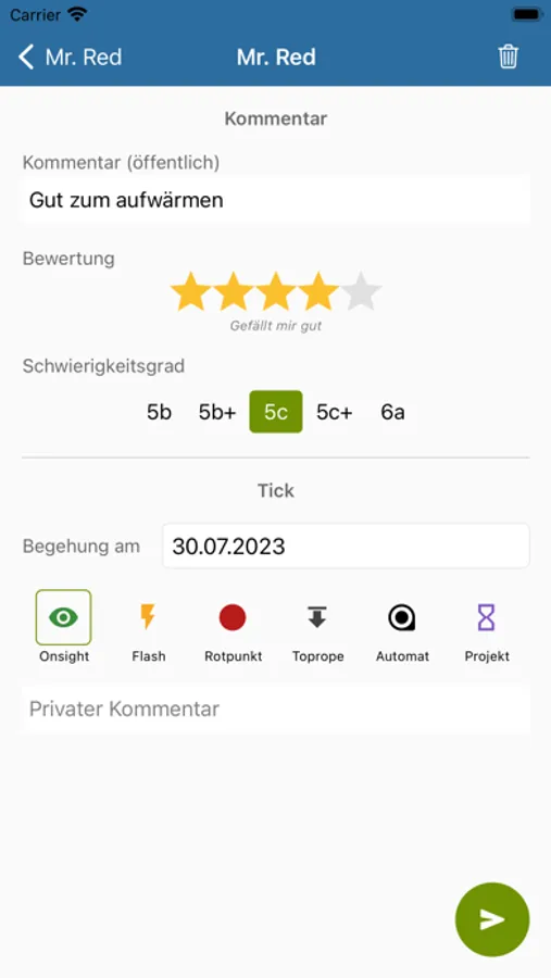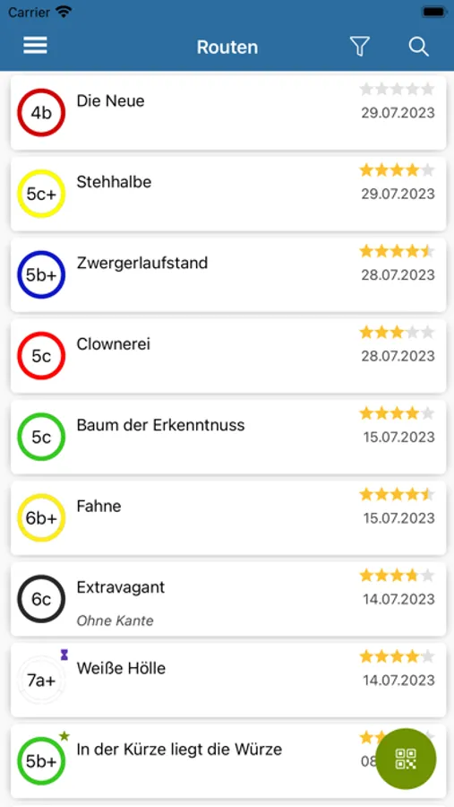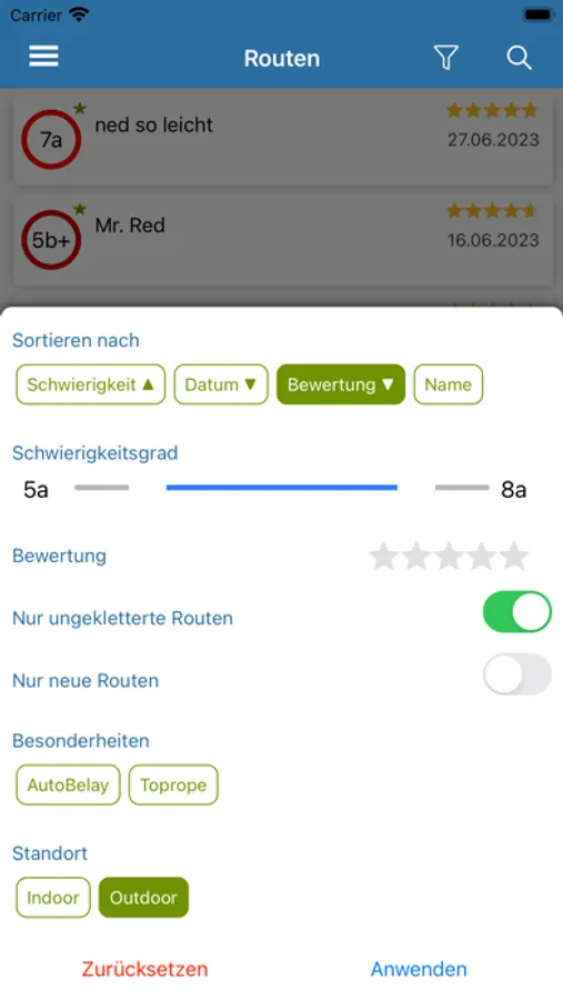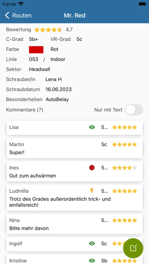 Ihr könnt Routen nach Schwierigkeitsgrad und Schönheit bewerten, eigene Kommentare abgeben und die Kommentare anderer Nutzer vor dem Einstieg lesen. Darüber hinaus könnt ihr eure persönliche Tickliste pflegen um eure Projekte im Auge zu behalten oder noch nicht gekletterte Routen in der Halle zu finden.