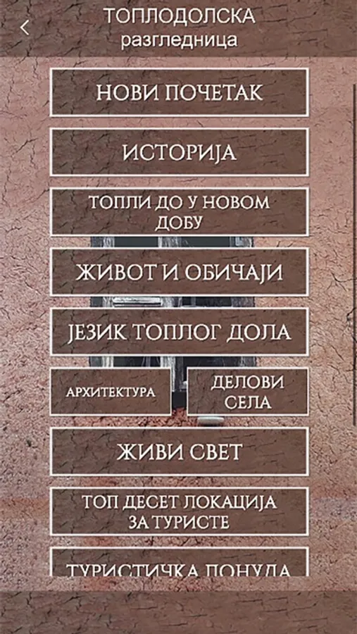 The application shows the turbulent history of the village of Topli Do in Stara Planini Serbia, the efforts of the residents for the survival and preservation of the natural environment, shows the natural beauty of this region and points to significant tourist potentials.