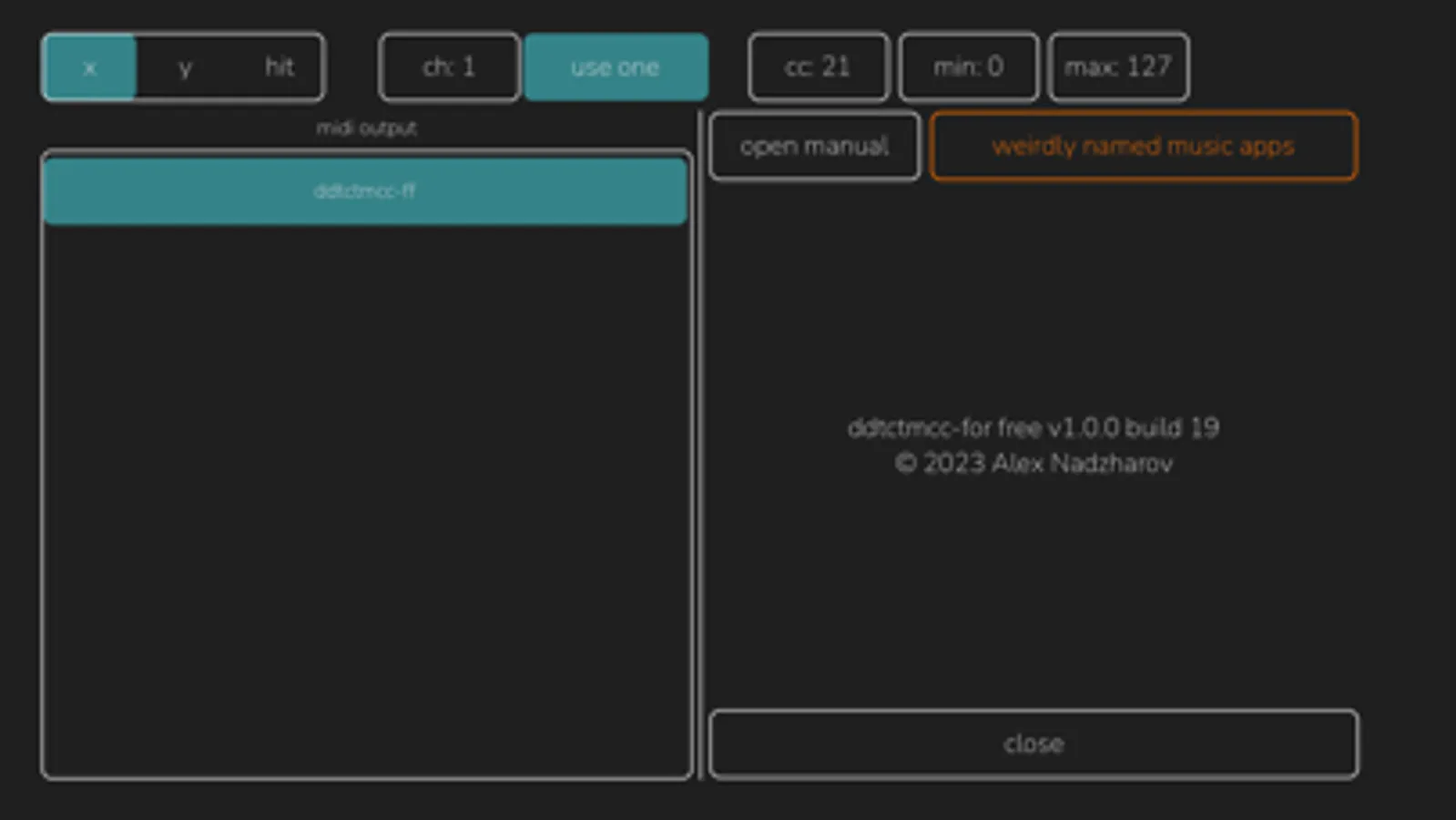 This is a free compact version of "ddtctmcc" touch control app that is designed to work with touch gestures and output MIDI Control Change messages.
