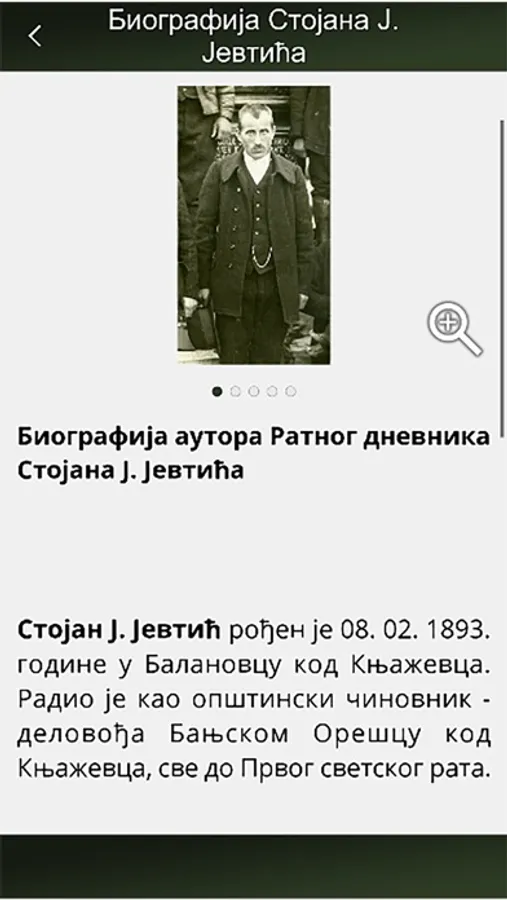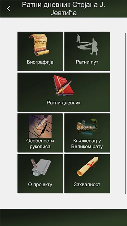 Application War Journal Stojan J. Jevtić is part of the project of the Regional Museum of Knjaževac, author Milena Milošević Micić, which includes the digitization of manuscripts, the press of the War Diary from the First World War 1914-1918 Stojana. J. Jevtić, interpretation and presentation through the preparation of the exhibition from the War Diary 1914-1918 and the production of multimedia content.