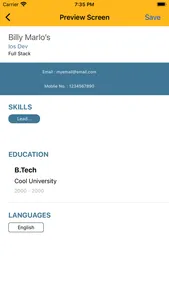 CreatCoolCV هو منشئ سيرة ذاتية بواجهة مستخدم بسيطة. ما عليك سوى النقر على الزر "إنشاء" على الشاشة الرئيسية للتطبيق للوصول إلى الصفحة حيث يمكنك اختيار موضوع سيرتك الذاتية. ثم تطرّق إلى السيرة الذاتية ليتم إرسالها إلى التفاصيل الإضافية ، حيث يجب عليك تقديم معلوماتك الشخصية بالإضافة إلى تاريخك التعليمي. بعد إدخال جميع المعلومات المطلوبة ، انقر فوق زر المعاينة. هناك يمكنك عرض مثال على سيرتك الذاتية. إذا كنت ترغب في ذلك ، يمكنك الرجوع وتعديل معلوماتك. بعد إجراء التغييرات اللازمة ، انقر فوق الزر "حفظ" في الزاوية اليمنى العليا. ستحفظ الأداة سيرتك الذاتية. شكرًا لك على ترك مراجعة على AppStore لهذا التطبيق.