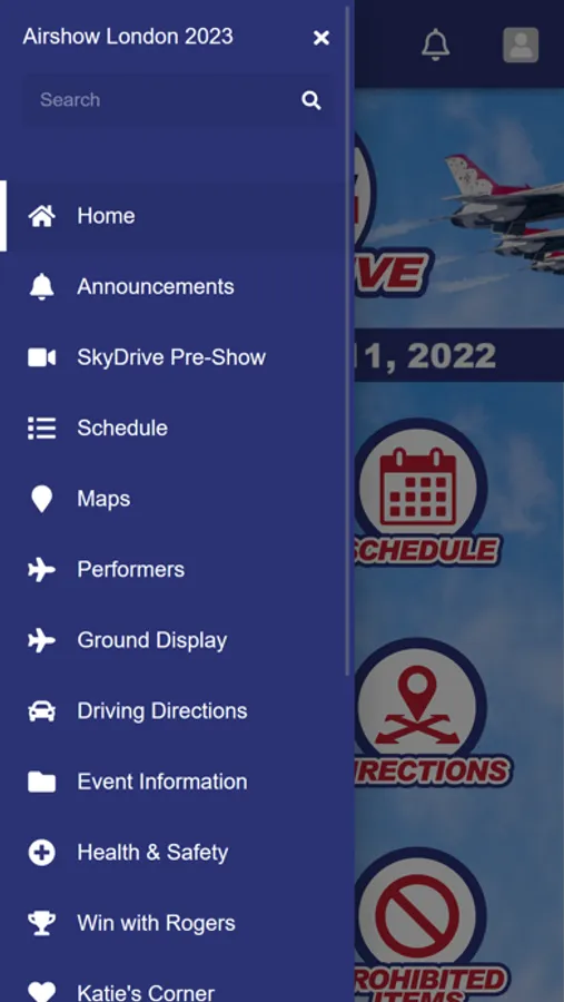 The official mobile event app of Airshow London's SkyDrive September 8-10, 2023. The SkyDrive App is your virtual event guide that includes everything you need to know, such as Driving Directions, Contests, Event Rules & Guidelines, Flying Schedules, Performer Profiles, and much more.