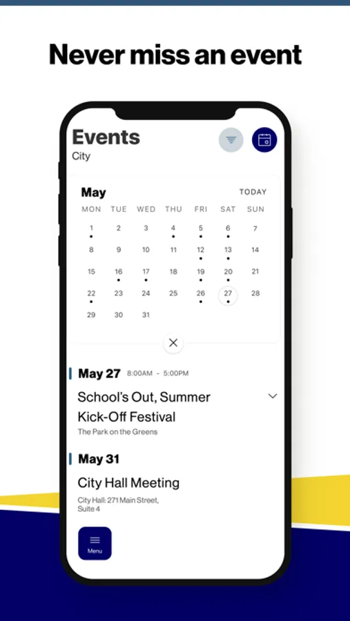 The event section shows a list of events throughout our community. Easily add an event to your own calendar and/or share the event with friends and family with one tap.