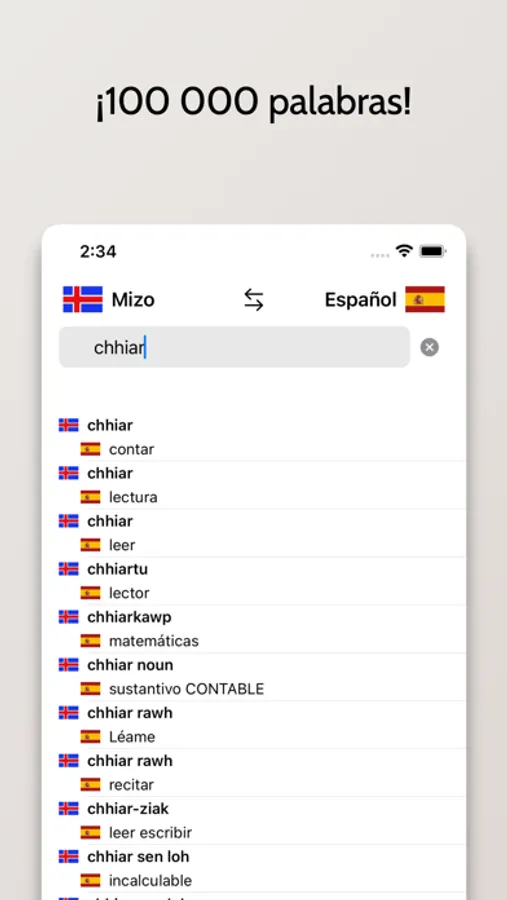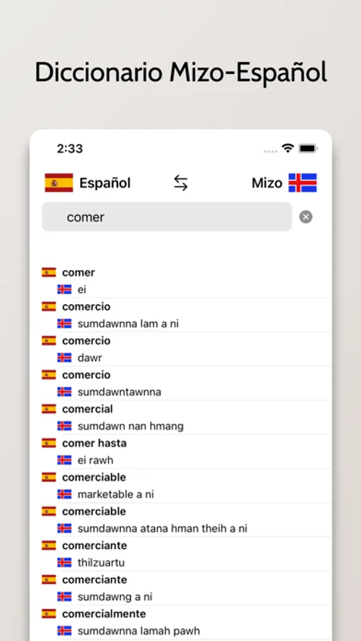 - Posibilidad de buscar a partir de palabras en Español o Mizo