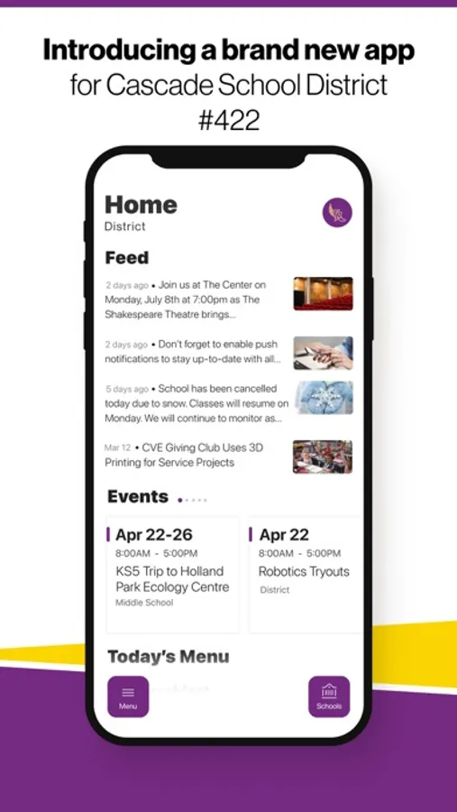 The event section shows a list of events throughout the district. Users can add an event to their calendar to share the event with friends and family with one tap.