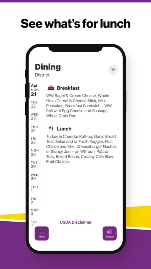 Within the dining section, you'll find an easy to navigate, weekly menu, sorted by day and meal type.