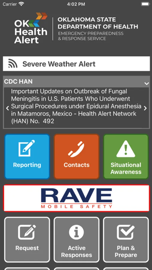 Emergency Mass Communication: Integrated with the Rave Alert mass communication platform, Oklahoma HealthAlert enables alert authors to send targeted alerts and prompts for information to app users. Alert authors can manage message recipients, create and send to user lists, and access your alert templates, all within the app.