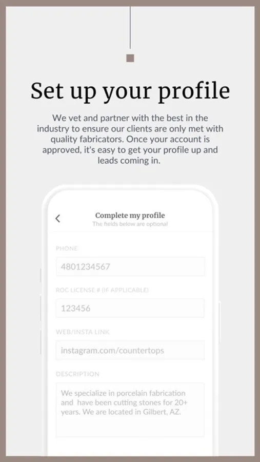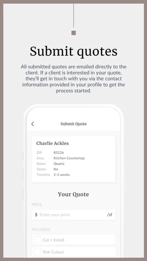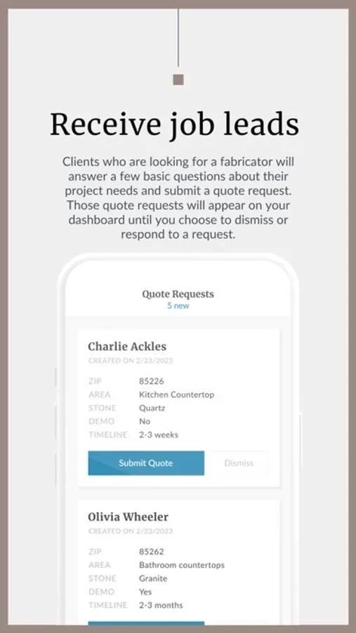 Stone Market is a business tool designed to help grow your stone fabrication business. We obtain and direct leads towards you, allowing you to submit fabrication quotes and bid on projects, follow-up with potential clients, and book jobs across your locale while on-the-go.