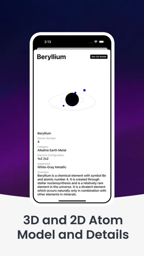 Dynamic Periodic Table: Say goodbye to traditional periodic tables. Tap on any element to unlock its secrets, from electron configuration to its appearance. Dive deeper with visual 2D and 3D models that illustrate the atomic structure, offering an enriched perspective of each element.