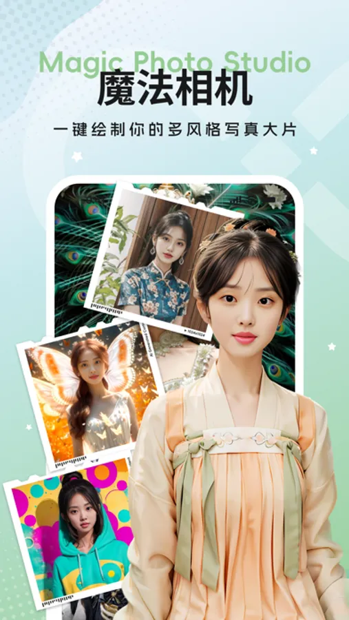 奇思妙影的“魔法相机”模块为各位男神女神准备了风格写真、创意插画、多元宇宙不同主题共100+模型,从旅拍写真到古风大片再到动漫变身,带你体验百态人生。选择心仪的风格后上传一张五官清晰的照片,即可得到不同风格的写真大片。