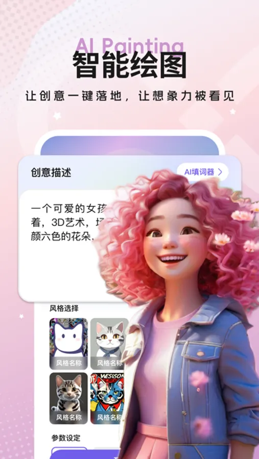 用户在奇思妙影的“智能绘图”模块自由输入创想文字,即可生成国风,油画,动漫,写实等二十余种不同风格的画作,高效的同时,让专业度与创新力得到全面提升,满足个性化的图片生成需求。