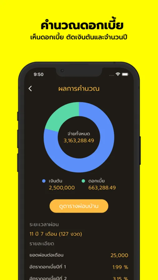 3. แสดงข้อมูลเป็นรายเดือน: ตารางการผ่อนชำระที่ได้รับการคำนวณจะถูกแสดงผลเป็นข้อมูลรายเดือน ที่นี่ผู้ใช้สามารถเห็นว่าในแต่ละเดือนจะต้องชำระเงินกี่บาท โดยแบ่งเป็นส่วนของดอกเบี้ยและเงินต้น