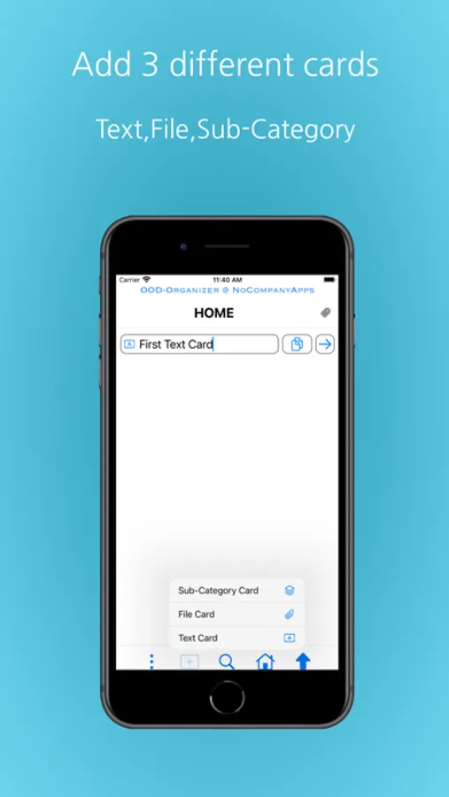Organise your data-to-day data smartly and efficiently with OOD-Organizer with three powerful cards: Text Card, File Card, Sub-Category Card. Text Card is for storing raw text. File Card is for storing documents like pdf, images etc. Sub-Category is like a directory in computer. You can have multiple nested Sub-Categories as you can have multiple nested directories in computer. Each nested Sub-Category can have multiple Text, File and Sub-Category cards.