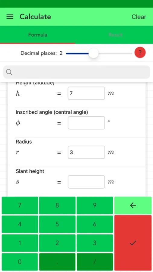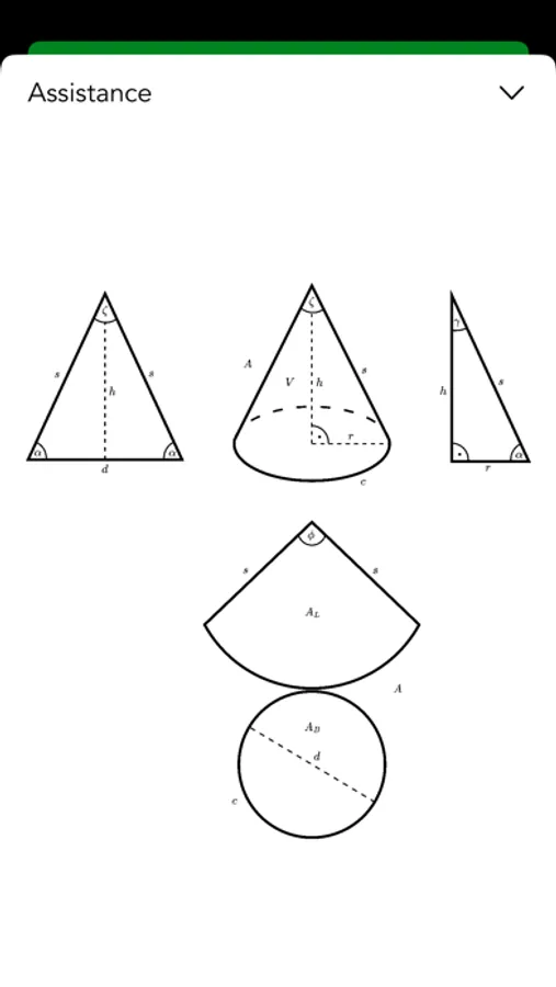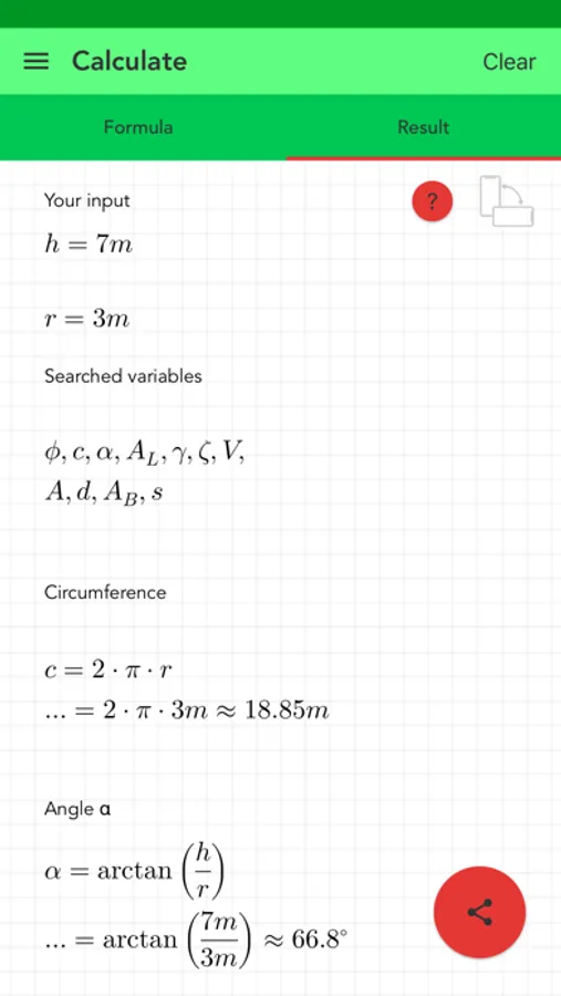 The best app to calculate all quantities of a circular cone. You must enter some quantities like the radius and a height. The algorithm searches the formulas of the missing quantities, shows them and calculates the results.