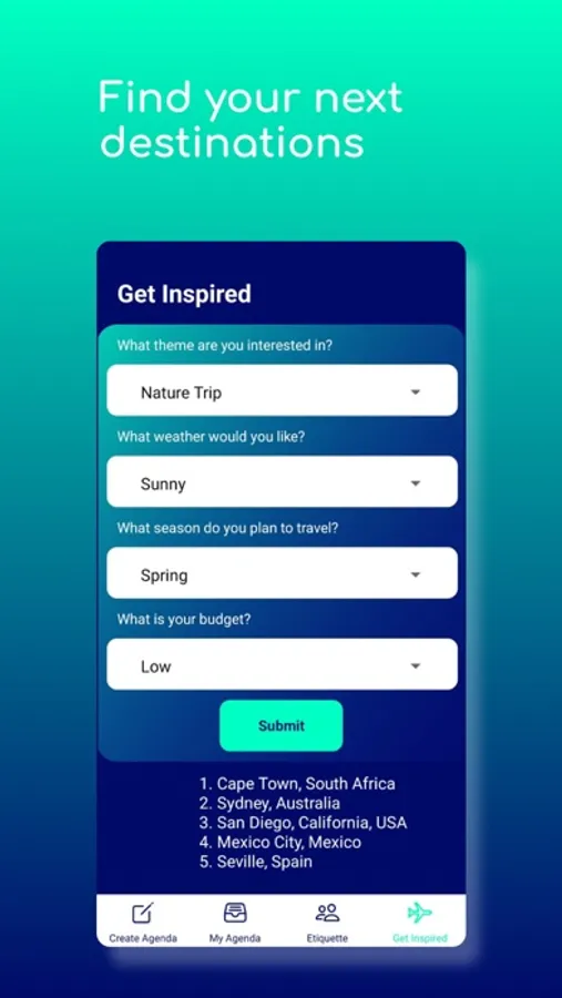 Indecisiveness ends here. Share your passions – be it art, gastronomy, adventure, or relaxation – and let TravelPilot recommend cities that resonate with your interests. Explore new horizons, embrace the unfamiliar, and embark on journeys perfectly attuned to your desires.