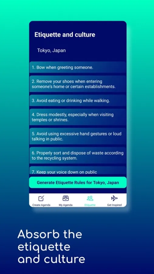 Respectful travel paves the way for global harmony. TravelPilot goes beyond ordinary travel apps by presenting you with a compilation of the ten most vital etiquette rules for each destination. Achieve cultural fluency, foster local connections, and ensure your travels leave a positive footprint.