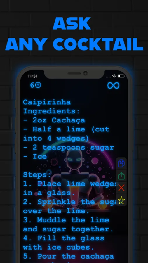 Meet Mix, your AI bartending assistant! With Mix, you can effortlessly create any cocktail you desire. Just tell us the name of the cocktail, and we'll show you exactly how to make it. Powered by the cutting-edge ChatGPT technology, Mix is more than just a recipe app. It's like having a personal bartender in your pocket!