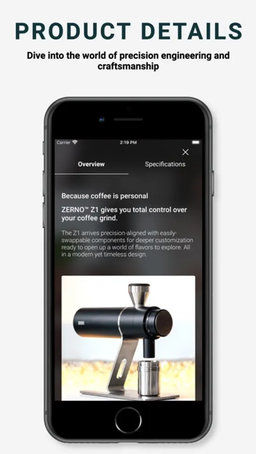 AR Showcase: Witness the Zerno Z1 grinder's beauty in your environment through the power of AR. Place it on your countertop, spin it around and see how it fits perfectly into your space.