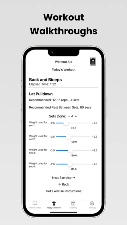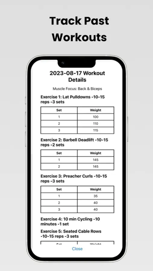 Never feel lost in the gym again! Our app will guide you through each exercise with optional step-by-step instructions. Enter you sets done, weights lifted and track workout times as you go.