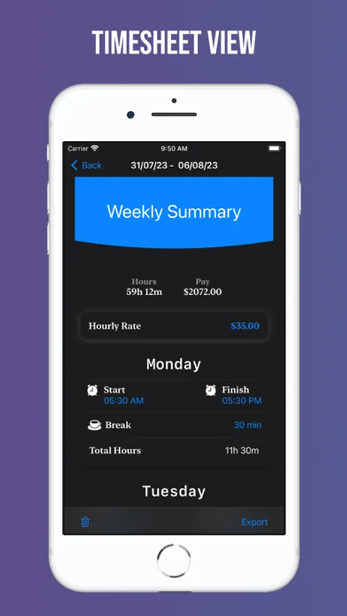 Track your work hours with Timesheet Pro! Enter your start and end time each day, and calculate your total work hours and pay. At any time, you can export your timesheet as an invoice. Weekly time tracking has never been this easy!
