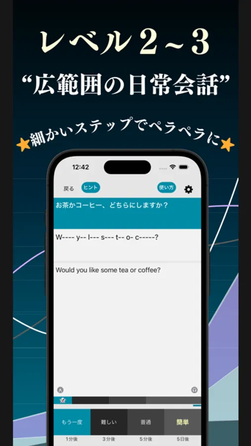 *AI先生と好きなお題で英会話できます。レッスンのレベルも5段階(初級〜超上級)で細分化されており、自分に合った最適なレベルでレッスンできます。オンライン英会話が恥ずかしくて始められない方やオンライン英会話が高価だと感じる方に最適です。コスパよくまるで本物の人間とレッスンしているような体験が可能です。レッスンの終わりにはAIにより会話の復習問題を作成することができ、後ほど瞬間英作文問題として復習が可能です。