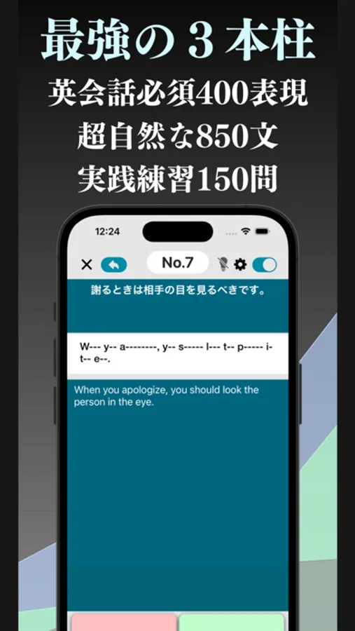 * 本アプリの最大の特徴は、英文が「日常英会話でそのまま使える」ほどナチュラルな点です。大量の洗練された英文で瞬間英作文トレーニングをすることで、着実に力がつきます。
