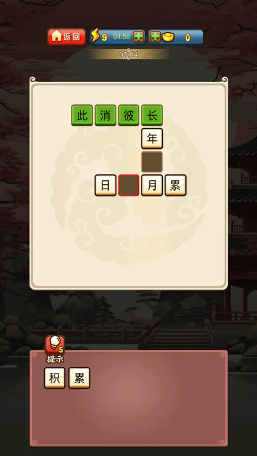 成语填字玩法是游戏的核心模式。在成语填空中,纵横交错着若干个成语。每一个成语都有一个空白方块等待你去填充。你要从备选的汉字中选取恰当的字,填写在适当位置,使得纵向和横向的成语都能成立,就答对了题目!游戏一共有800关,每关都有数个成语,相当于整个成语词典的成语等待你的挑战!你需要充分运用你的智慧,经过800关的洗礼,想必你一定能成为成语小英雄!