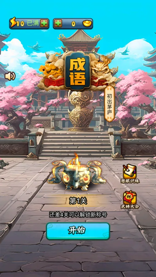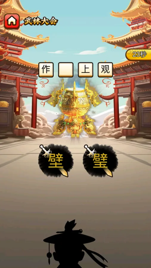 武林大会是一个非常新颖的模式,类似于在汉字找茬王。在每一关中,我们会出示一个常见的容易出现错别字,或者使用错误的成语。并提供两个选项。比如:“临渊 ?鱼”。选项是“羡”和“献”。你需要点击正确的“羡”字。在这个模式下,你需要了解成语真正的含义,精确使用汉字,才能做对题目,成功闯关。