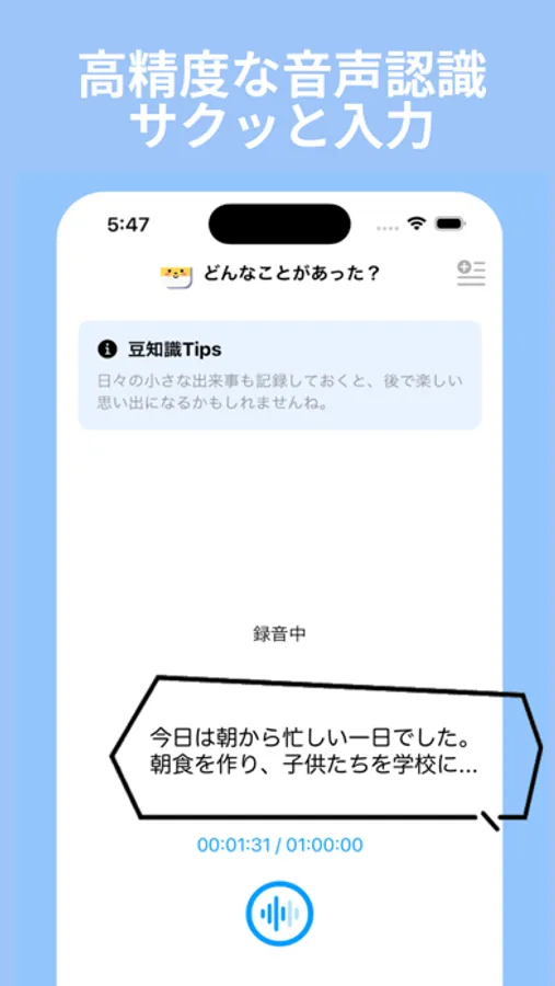 音声メモ日記アプリ「シャべマル」は、あなたの日々のできごとや感想を素早く記録し、自動的にタイトル生成や絵文字、感情、カテゴリ分けまで行い、充実したメモ習慣をAIによって強力にサポートします。