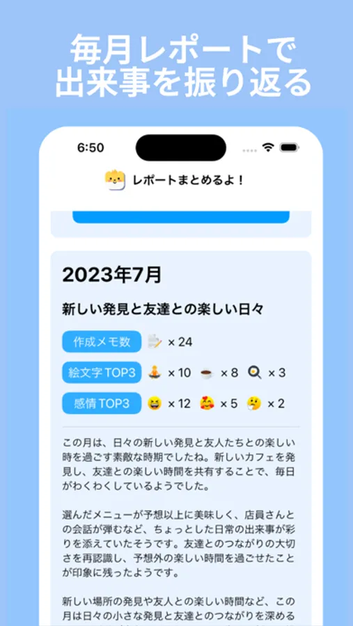 また、蓄積されたメモから振り返りレポートも作成ができ、毎月のできごとを思い返すことができます。これは従来のメモアプリでは得られない、新しい記録体験です。