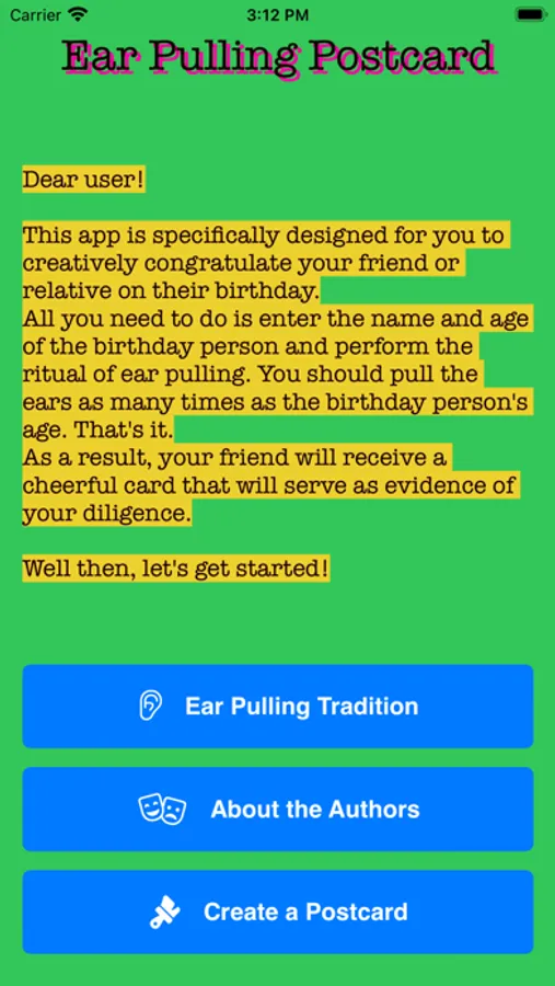 All you need to do is enter the name and age of the birthday person and perform the ritual of ear pulling. You should pull the ears as many times as the birthday person's age. That's it.