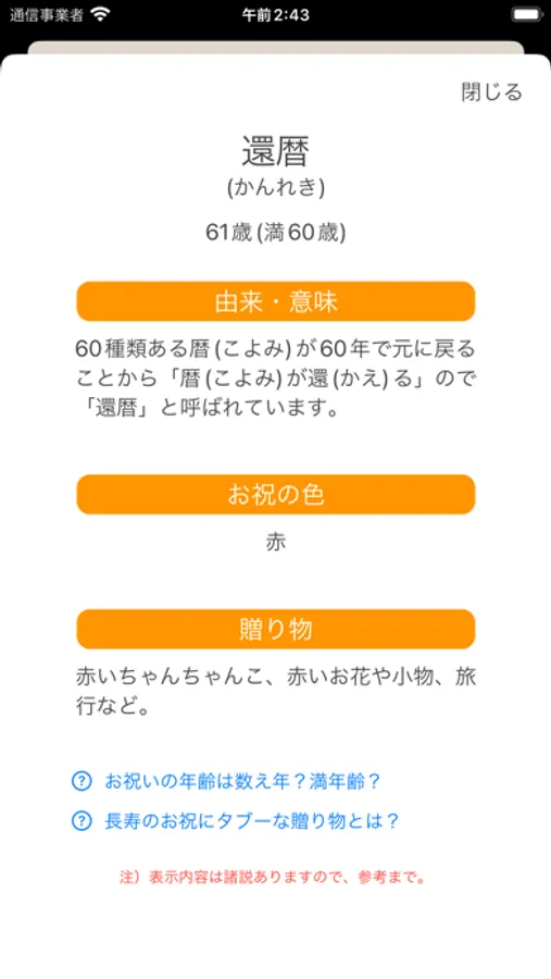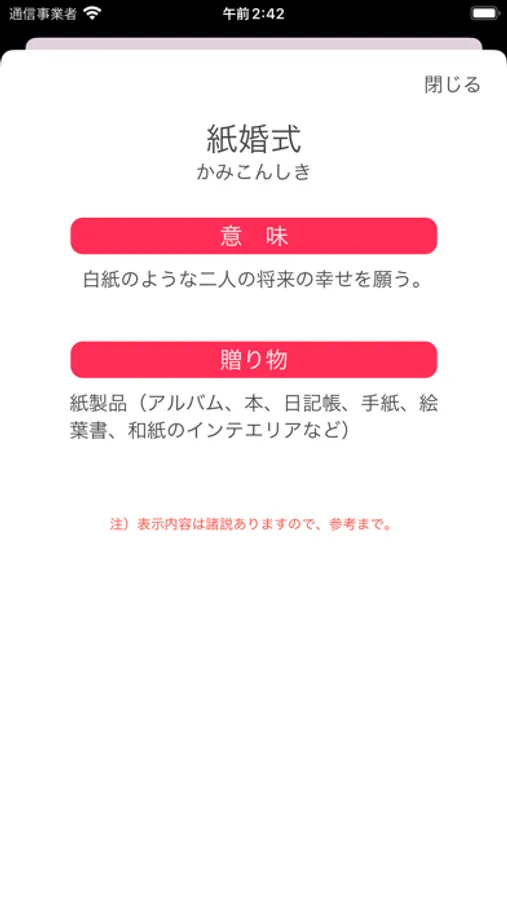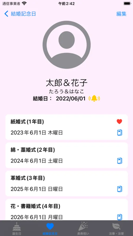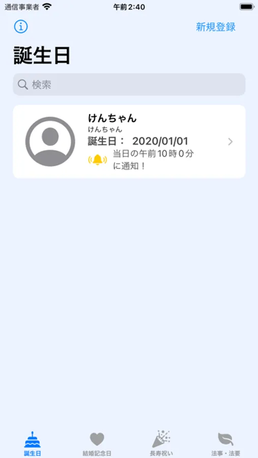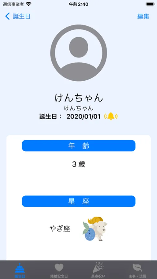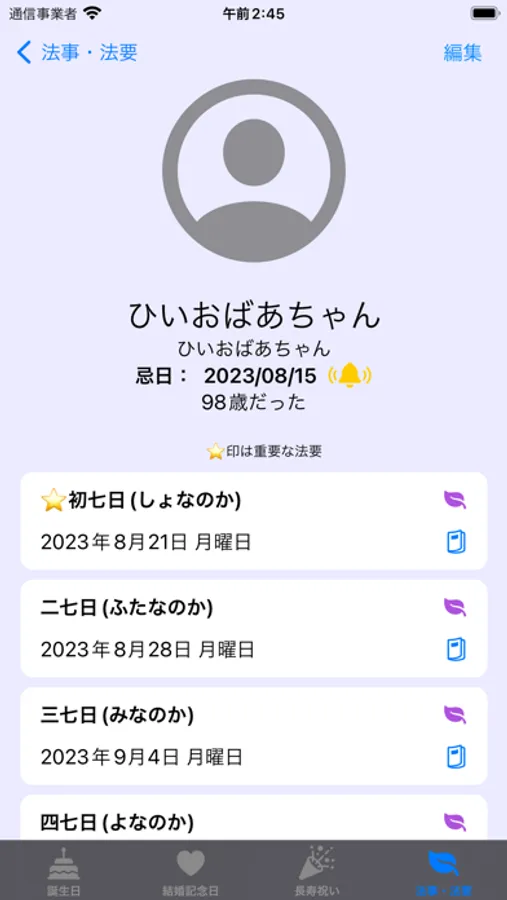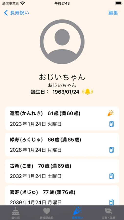 誕生日、結婚記念日、長寿記念日、法要の日などの情報を登録して通知設定をすると、希望する日時にプッシュ通知でお知らせしてくれます。記念日の由来やそのお祝いにあった贈り物の例なども知ることができます。