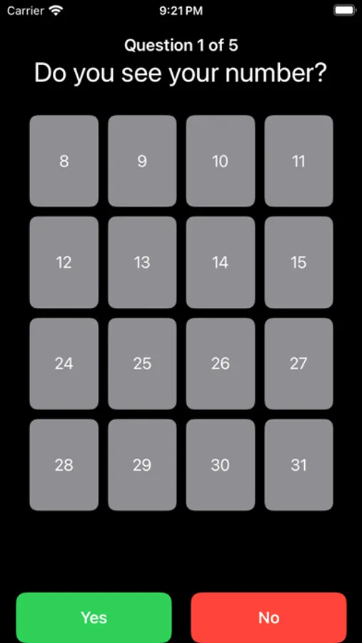 Amaze your friends with this simple, yet enchanting application. Have yourself or someone else choose a secret number. Answer a brief series of 5 simple questions, and let the magic unfold. Watch in awe as the application accurately presents the very secret number you had in mind!