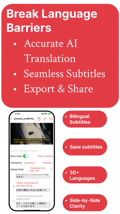 - Translation, Break Language Barriers: Translate between over 30 languages and effortlessly understand foreign language videos!