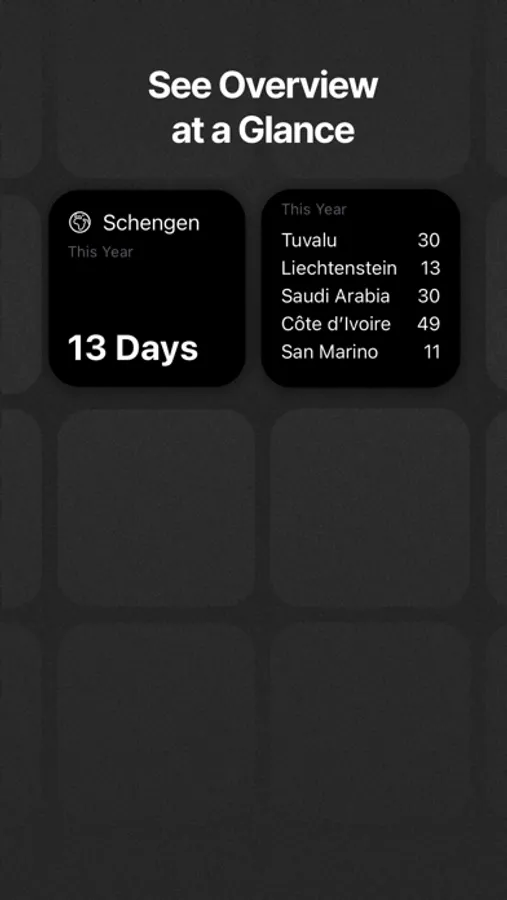 Count days abroad: Track your time spent in different countries, ensuring you're always aware of your stay durations for a hassle-free travel experience.
