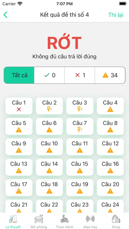 - Danh sách các câu hỏi đã làm sai giúp nhanh chóng ôn lại phần lý thuyết.