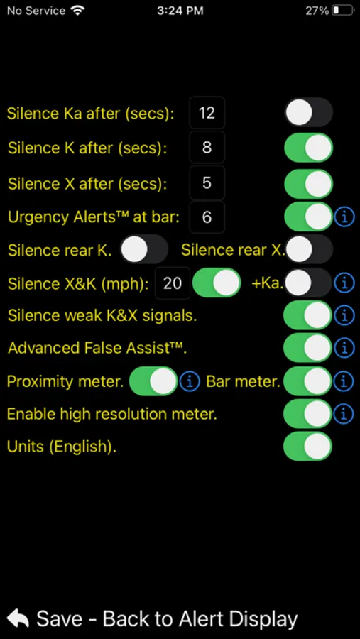 • Automatic muting of Ka, K, and X bands ('Time before mute' set for each band).