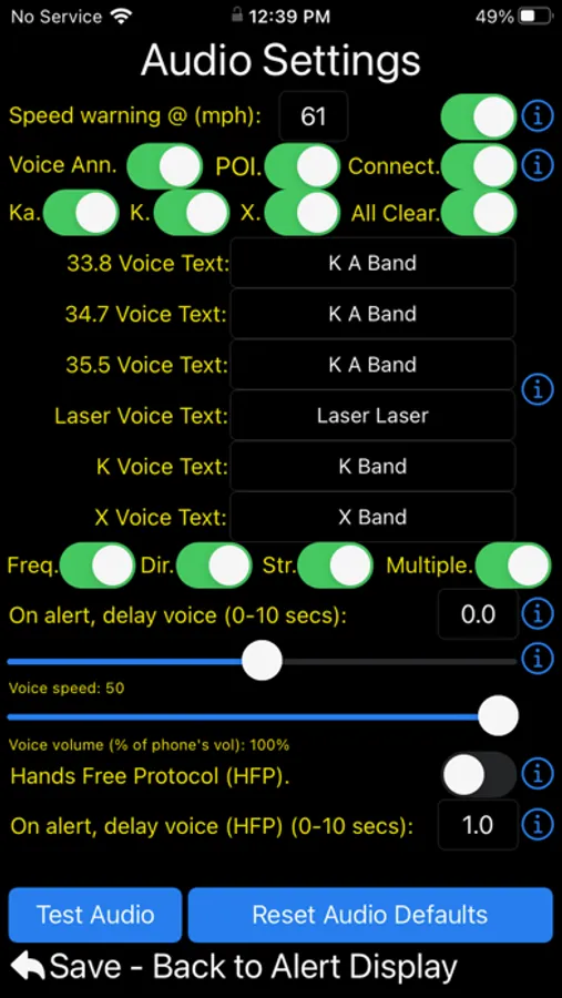 • Detailed & intelligent voice announcements of direction, band, frequency, strength, number of alerts, occurrences of mixed signals and more.