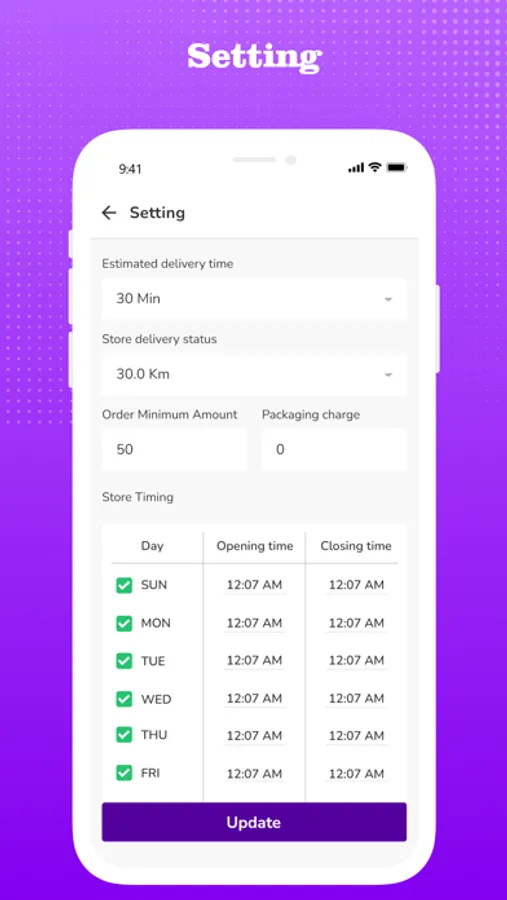-Manage store details like store timing, address, estimated delivery charges, packaging charges, minimum order amount, delivery radius, etc.