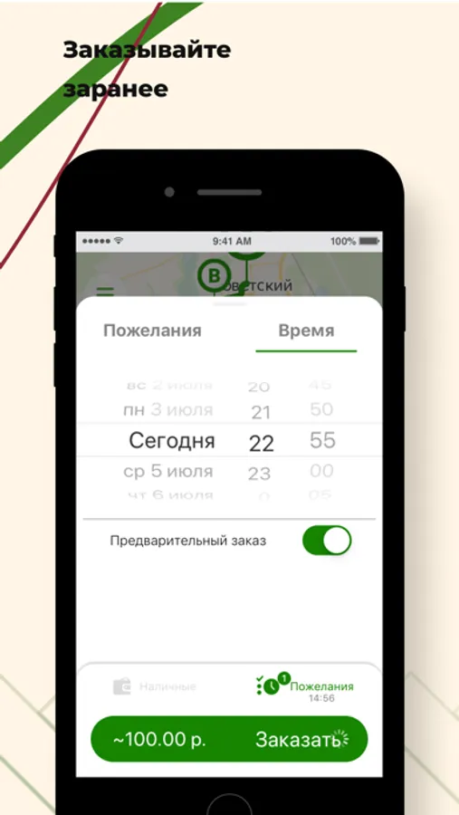 Выберите опцию “Предварительный заказ”. Поиск автомобиля начнется незадолго до заказа поездки, и автомобиль приедет к назначенному времени. Также вы будете заранее знать стоимость поездки.