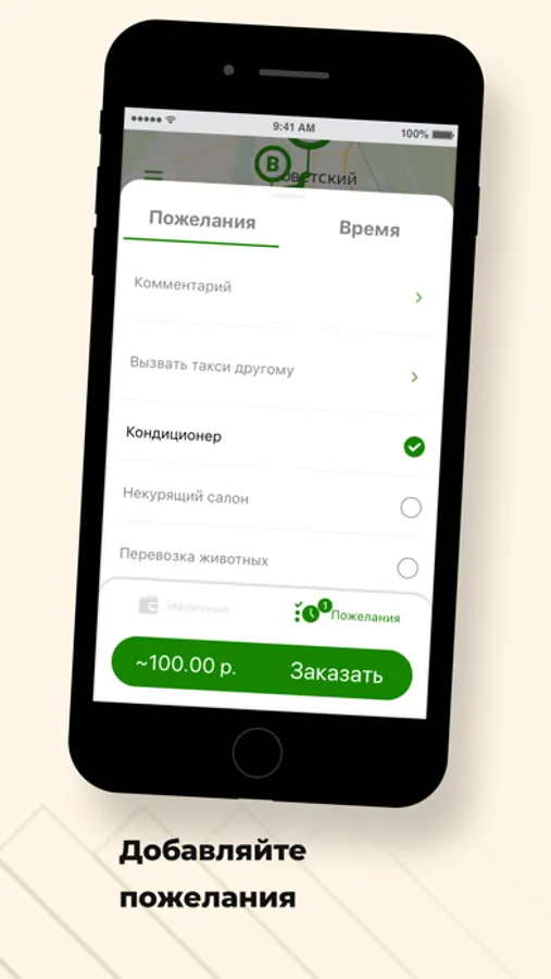 Добавьте к заказу дополнительные пожелания. Например, когда на улице +35 — выберите "кондиционер". Если вы не переносите запах табака — укажите "Некурящий салон", и к вам приедет некурящий водитель.