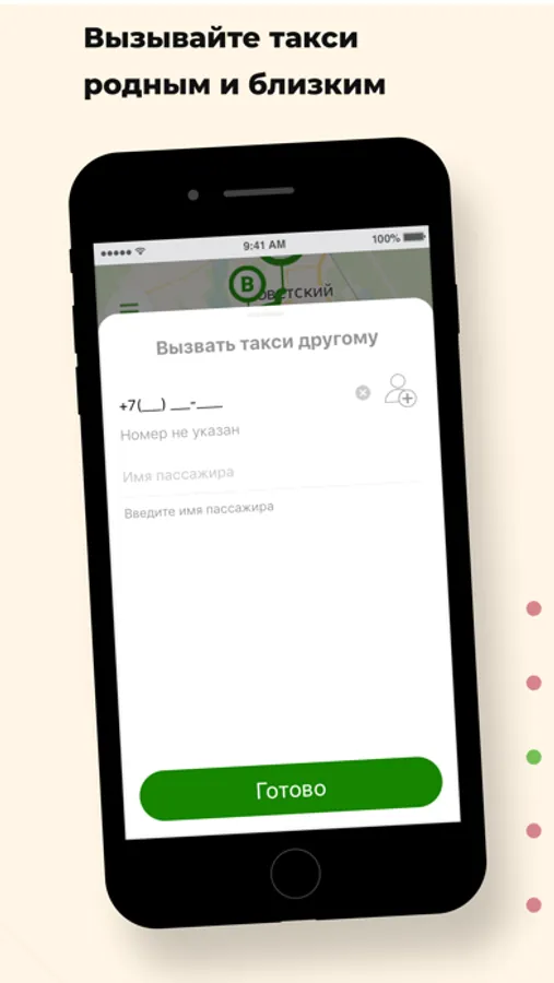 Используйте опцию “Вызвать такси другому” в разделе “Пожелания” и укажите его номер телефона. Когда такси подъедет, на указанный номер придет СМС, а вам — сообщение в приложении.