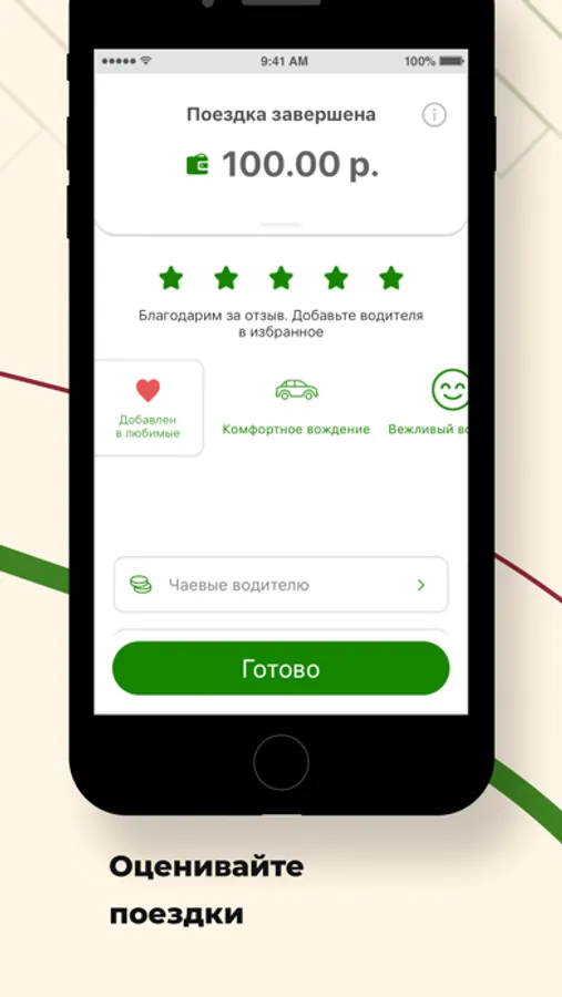 Поставьте оценку водителю, напишите отзыв или выберите реакцию из готовых шаблонов. Оставьте чаевые, если понравилась поездка