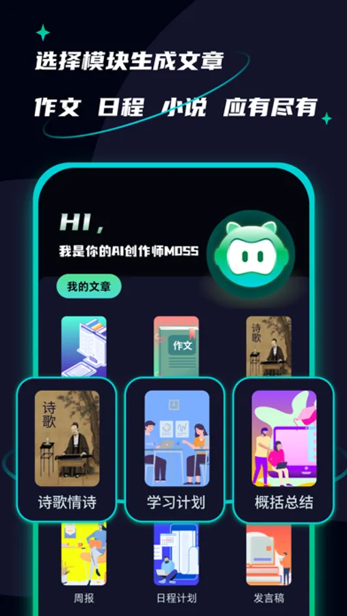 - 写作助手:AI拥有独特的创造力,不管是文章、作文、论文,小说,还是诗歌,都能帮您完成。还能写日报周报、视频脚本、广告语,是您工作中的智能助手