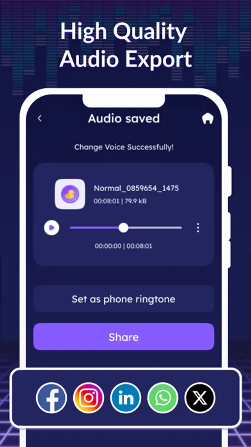 Export and Share: Share your voice-altered creations directly from the app to social media platforms, messaging apps, or cloud storage. Surprise your friends with voice messages they'll never forget!