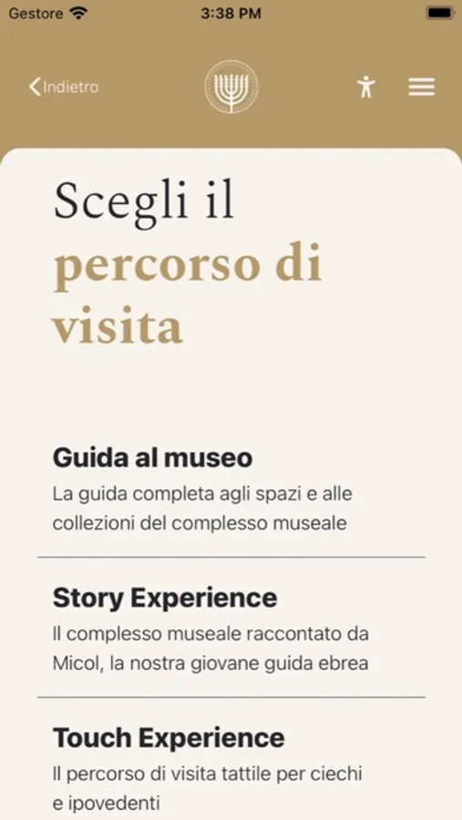 Se sei al Museo, l'App ti offre quattro percorsi di visita. Una guida agli spazi espositivi (GUIDA AL MUSEO), un'audioguida interattiva (STORY EXPERIENCE) e due percorsi pensati per persone con disabilità sensoriali: TOUCH EXPERIENCE, con audio-video descrizioni integrate con pannelli tattili dislocati lungo il percorso e LIS EXPERIENCE, con videoguide in Lingua Italiana dei Segni (LIS) e International Sign (IS).